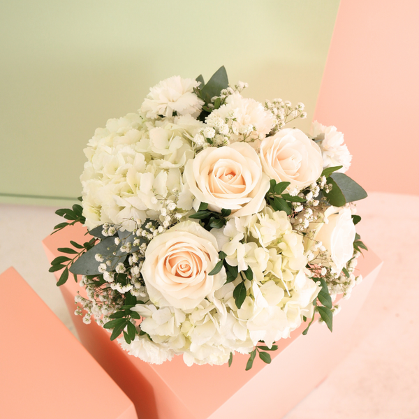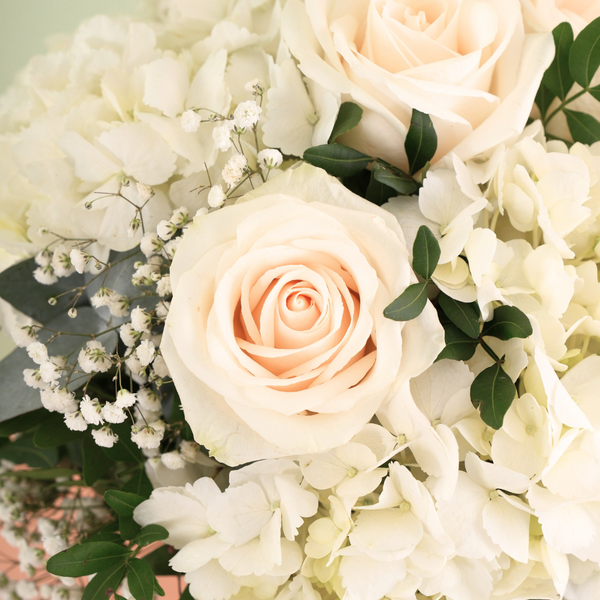 Indulge in the pure and serene beauty of our "Les Fleurs de l'Espoir" arrangement, featuring pristine white hydrangeas, classic white roses, carnations, delicate gypsophila, and fresh pistach leaves. This elegant and timeless bouquet is the perfect way to brighten up any space and create a sense of peace and tranquility.