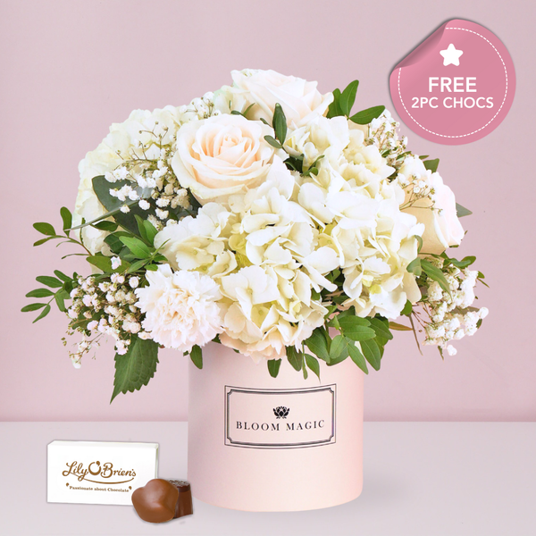 This arrangement comes with a Free Lily O'Brien 2pc Chocolate Set in the Petite Hatbox size.