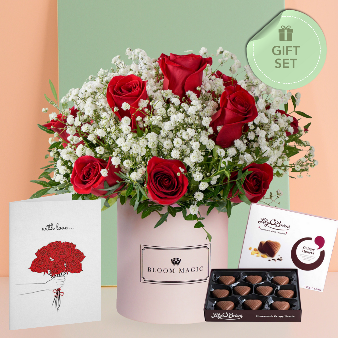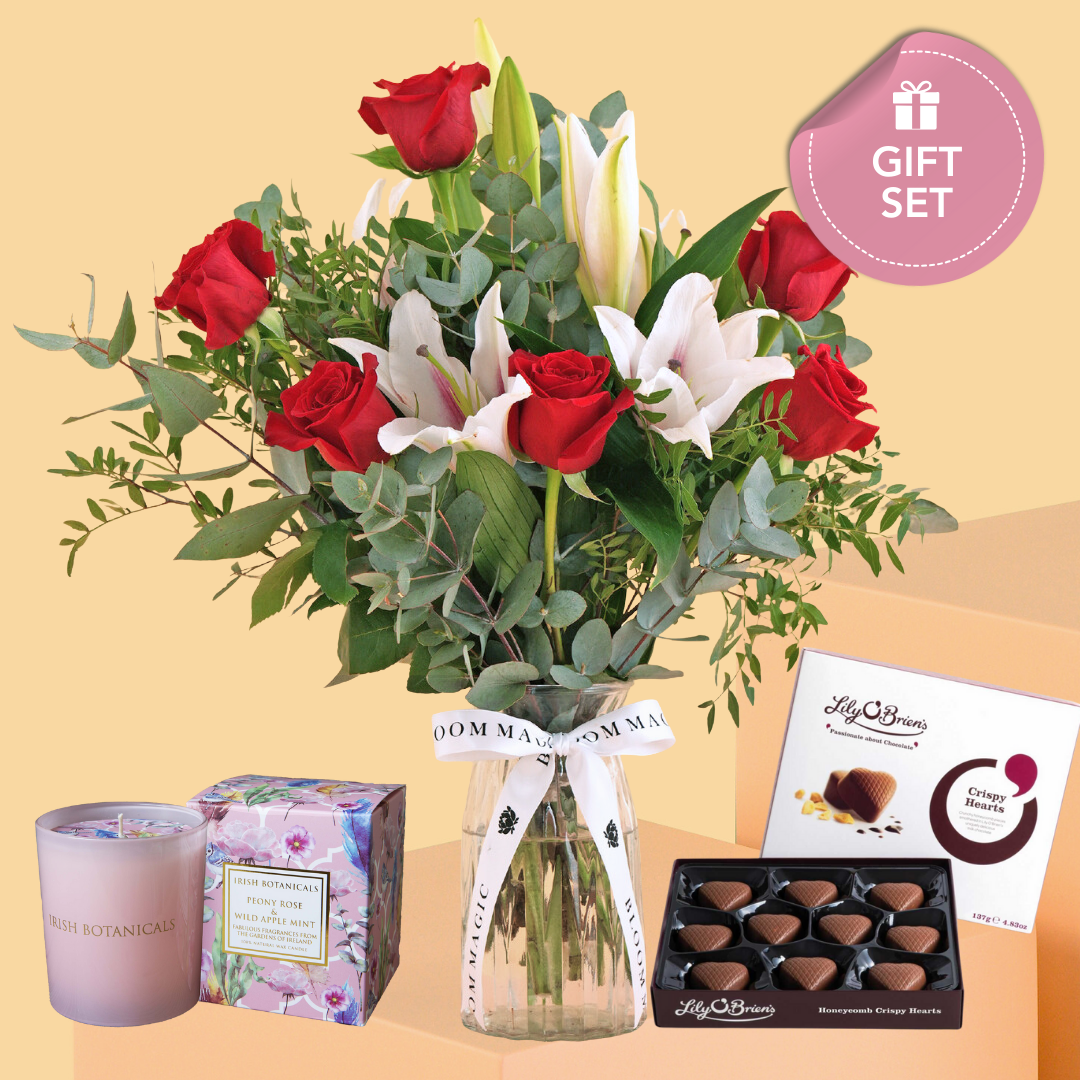 Thoughtfully curated extras like love cards, candles, and chocolates