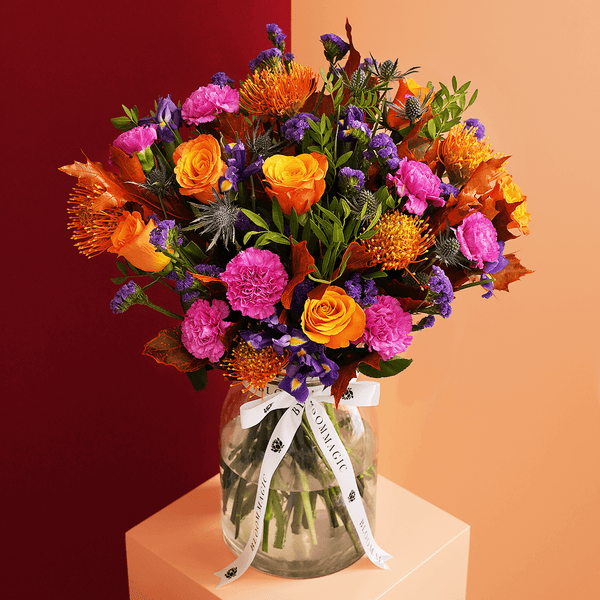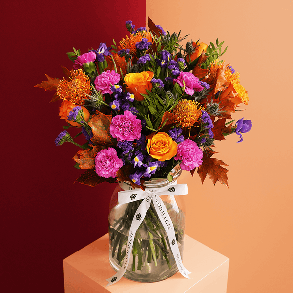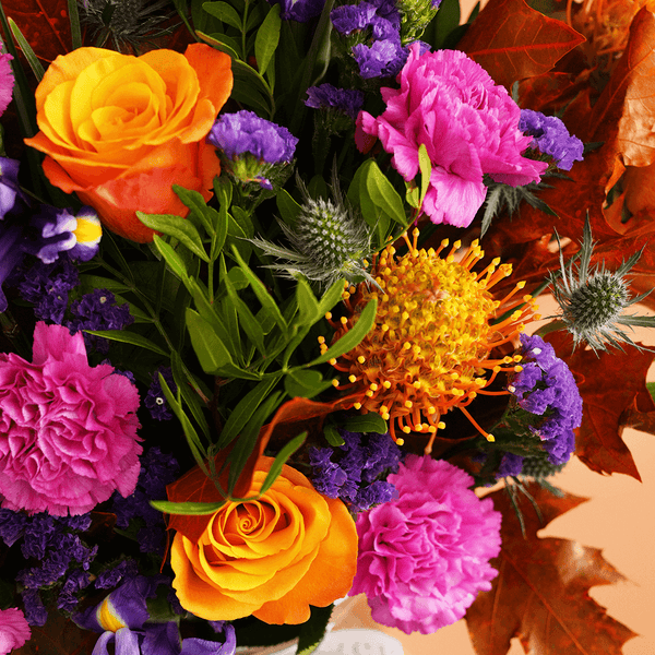Make a bold statement with the Maple Rêve Vase Large, a striking glass design overflowing with fiery orange roses, and lush purple carnations. Accented with nutan, thistles, statice, and oak leaves, this artisan arrangement captures the season’s beauty in a grand and unforgettable way.