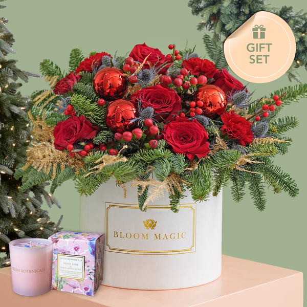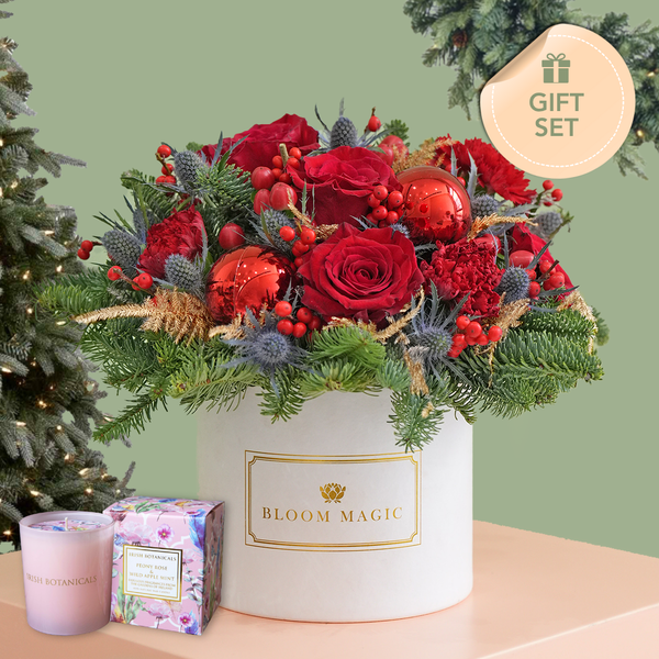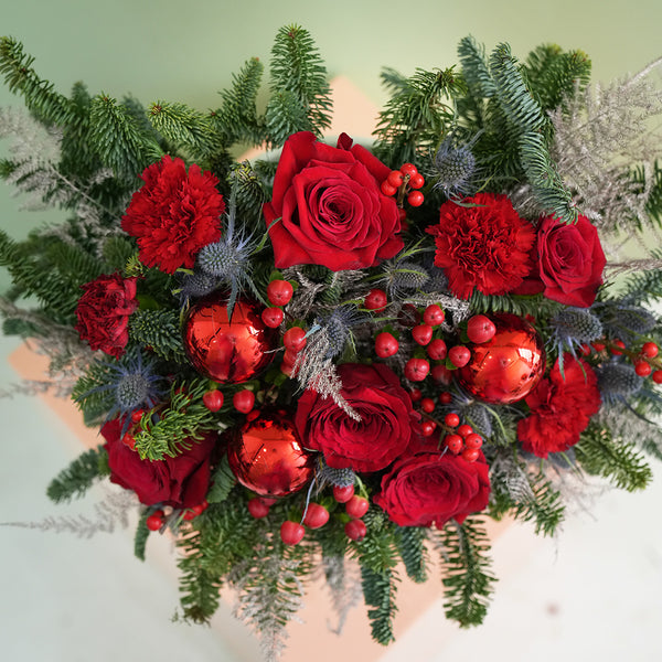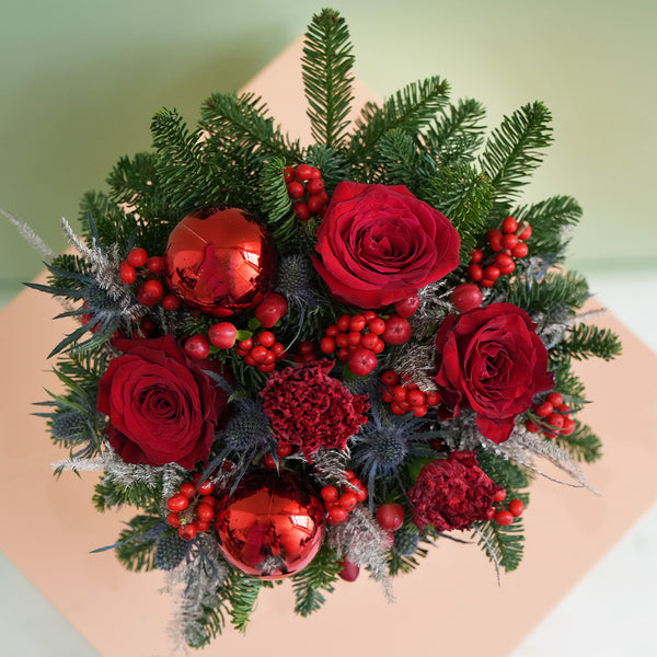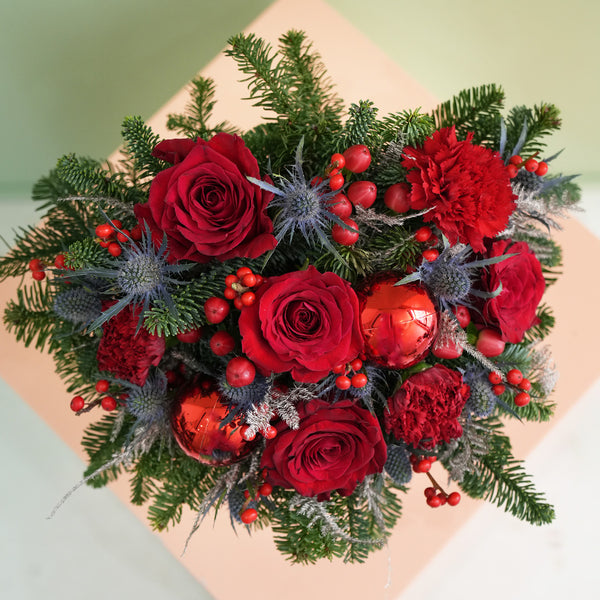 • The Holly Jolly Christmas Hatbox radiates festive elegance with red roses, carnations, ilex, hypericum berries, blue thistle, rose gold asparagus fern, noblis fir, and red baubles. A perfect centerpiece for sharing holiday cheer.