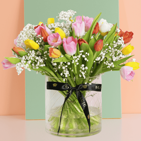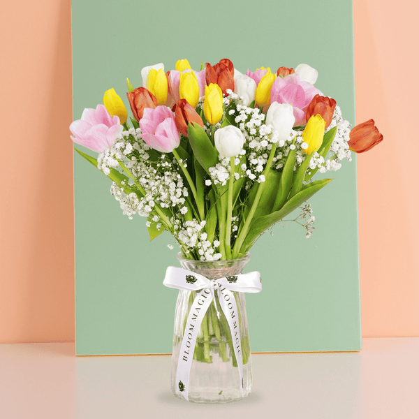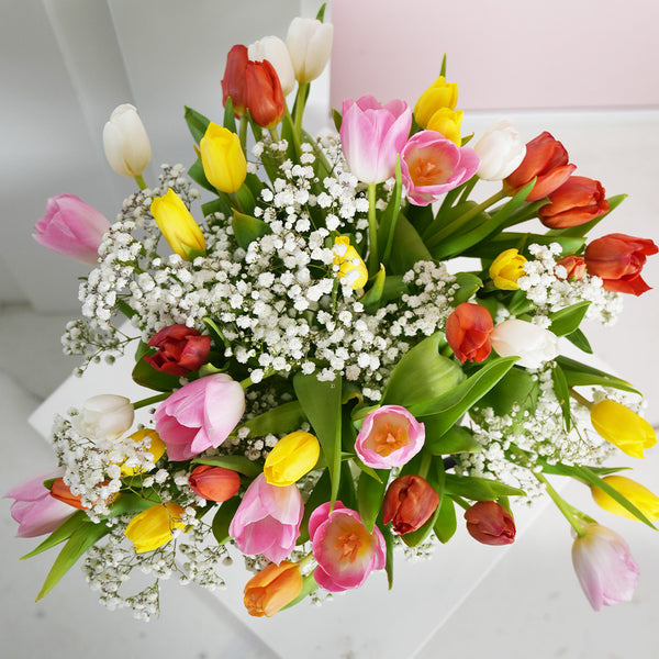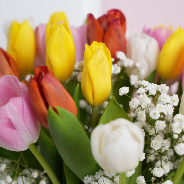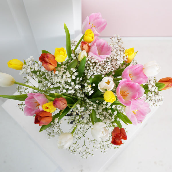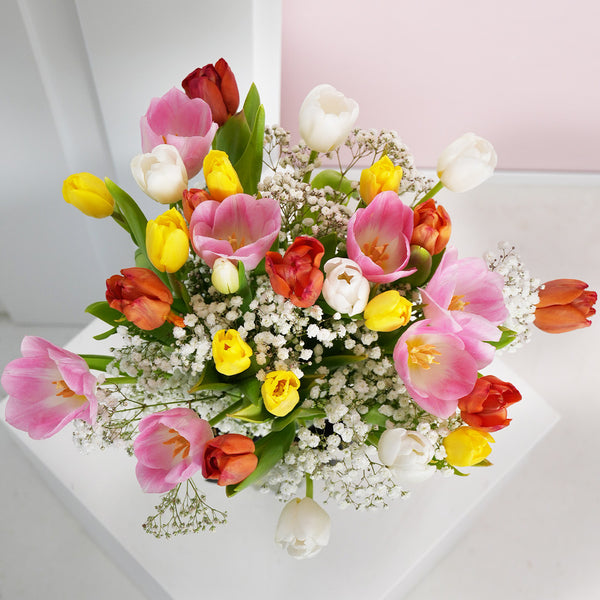 Add a burst of warmth with our Mélange Tulip Delight arrangement, combining vibrant orange tulips with classic white blooms and delicate gypsophila. Arranged in a vase, it’s a joyful and stylish choice for any occasion.