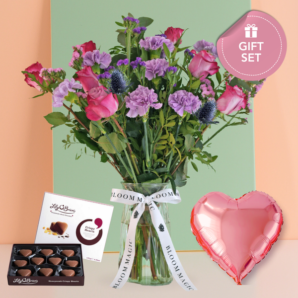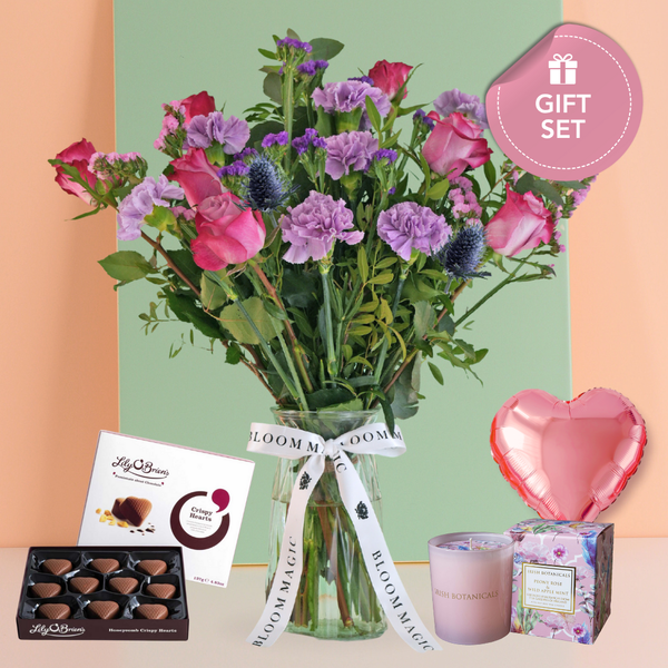 Option 3 - Lily O'Brien Crispy Hearts Chocolate, Occasion Balloon and Irish Botanicals Peony and Wild Apple Mint CandleOur flowers are delivered in bud for ultimate freshness and lifespan. Due to the seasonal nature of our flower arrangements, some secondary stems can vary and actual flower hues may also vary from those displayed in the images.