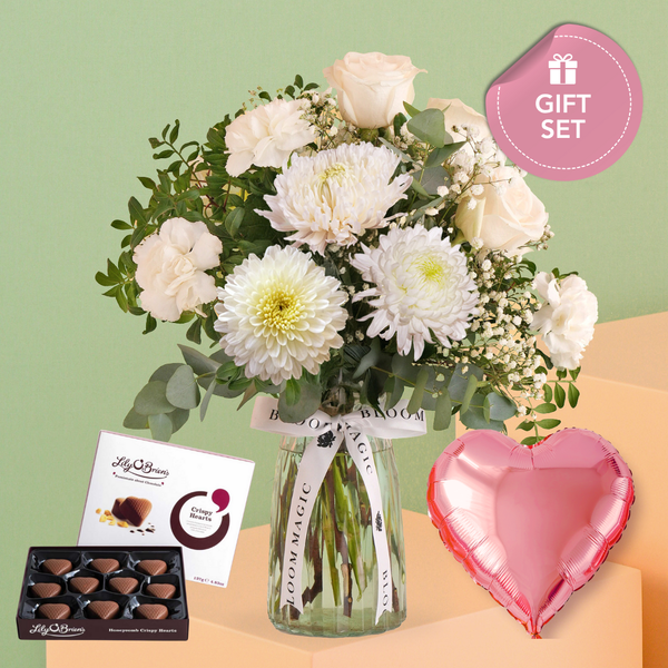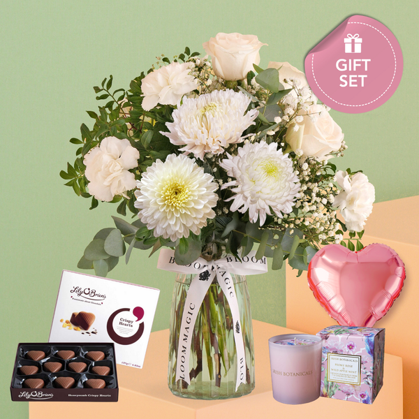 Option 3 - Lily O'Brien Crispy Hearts Chocolate, Occassion Balloon and Irish Botanicals Peony and Wild Apple Mint CandleOur flowers are delivered in bud for ultimate freshness and lifespan. Due to the seasonal nature of our flower arrangements, some secondary stems can vary and actual flower hues may also vary from those displayed in the images.
