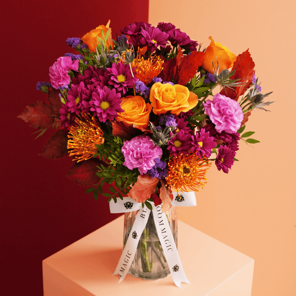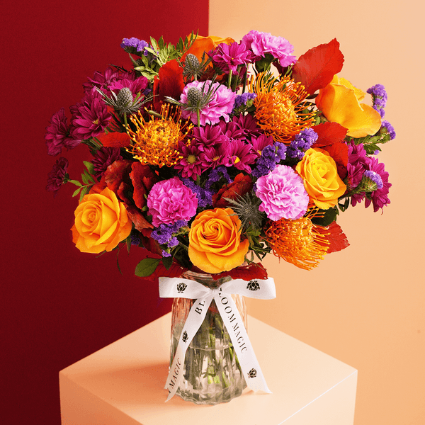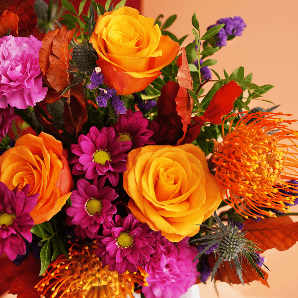 The Maple Rêve Vase brings together fiery orange roses, lush purple carnations, and delicate chrysanthemums with accents of nutan, thistles, statice, and oak leaves. Designed with sustainable style in mind, this artisan piece radiates warmth, charm, and effortless sophistication.