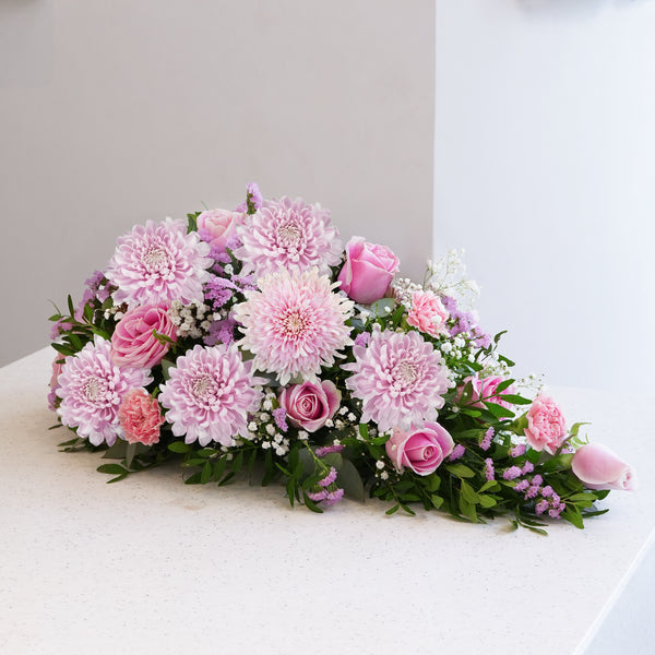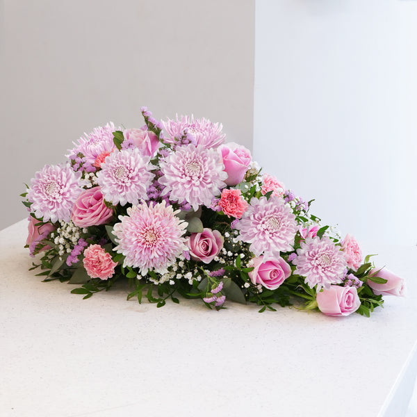 Features pink chrysanthemums, roses, carnations, pink statice, pistach leaves, and eucalyptus—offering a delicate and heartfelt tribute to honor your loved ones.