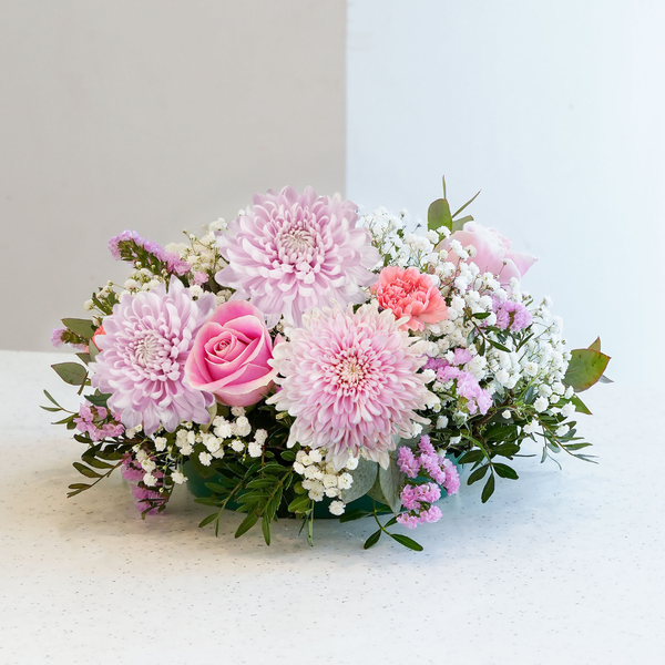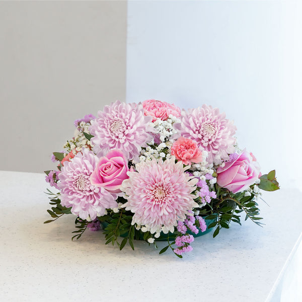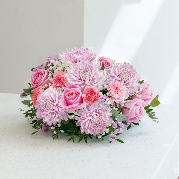 A simple, classic spray of large-headed roses, pink chrysanthemums, carnations, and seasonal fillers, accented with pistach leaves and fragrant eucalyptus—perfect for a thoughtful tribute.
