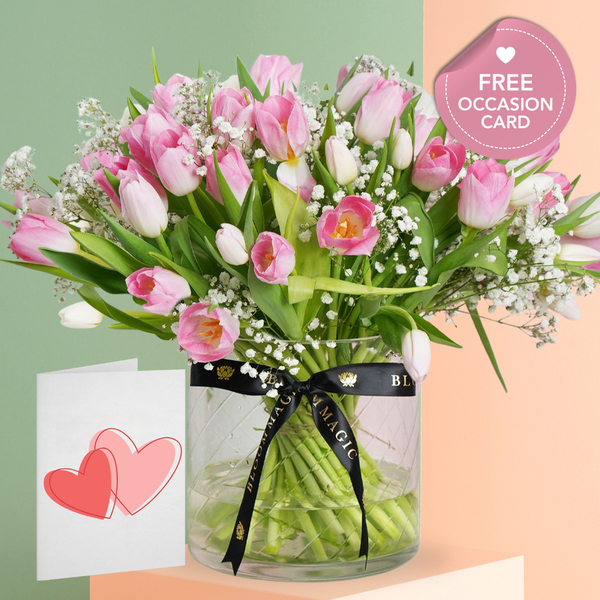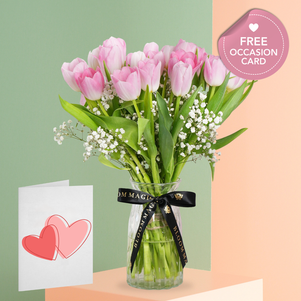 Indulge your loved one with the Pink Tulip Delight, a breathtaking bouquet showcasing lively pink tulips complemented by dainty gypsophila fillers, thoughtfully arranged in a sophisticated vase. This Valentine's Day, gift this artisan creation to bring a burst of warmth and joy, infusing their surroundings with the enchanting beauty and liveliness of spring, making it an ideal and delightful Valentine's Day surprise.