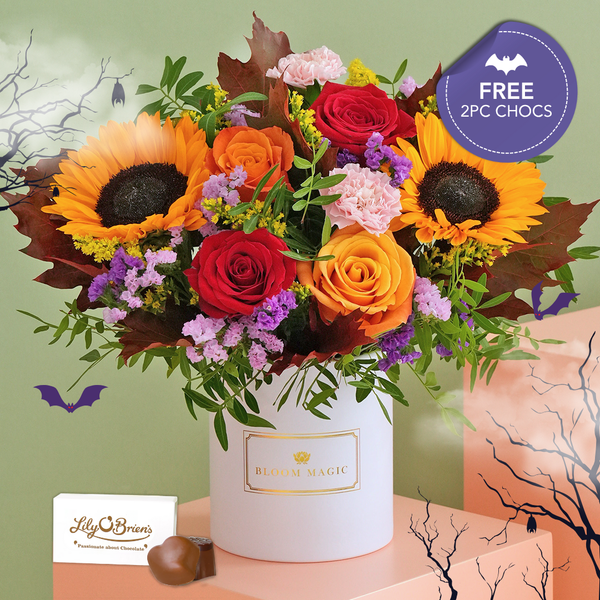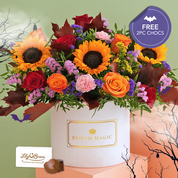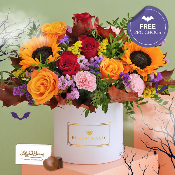 • A striking Halloween hatbox filled with red and orange roses, cerise carnations, sunflowers, statice, solidago, pistach leaves, and red quercus. A bold and bewitching arrangement that captures the spirit of the season.