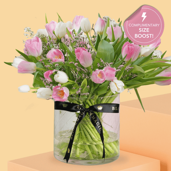 Fleurs Tulip Delight is a charming arrangement of pink and white tulips, accented with delicate sea spray in a vase. Perfect for any occasion, it adds warmth and cheer to any space.
