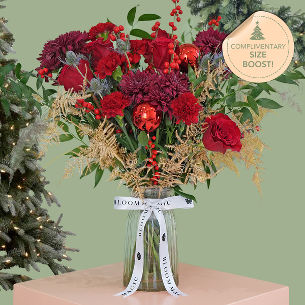 Celebrate Christmas with our Holly Jolly centerpiece, featuring red large-head roses, carnations, red ilex, hypericum berries, blue thistle, rose gold asparagus fern, ruskus leaves, and festive red baubles. A perfect, elegant touch for your holiday celebrations.