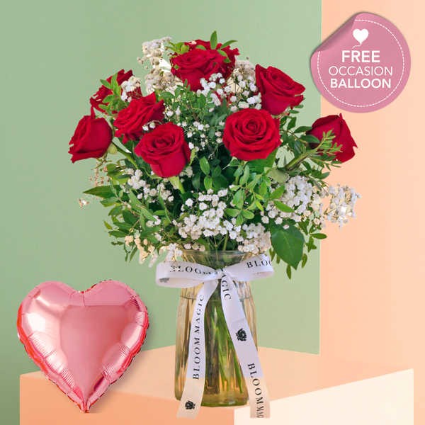 Indulge in a truly romantic gesture featuring 12 red roses, delicate gypsophilia and elegant pistach leaves in a vase.