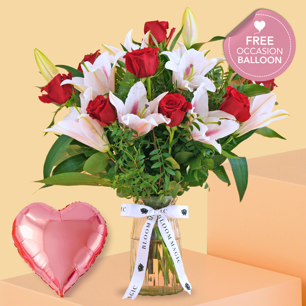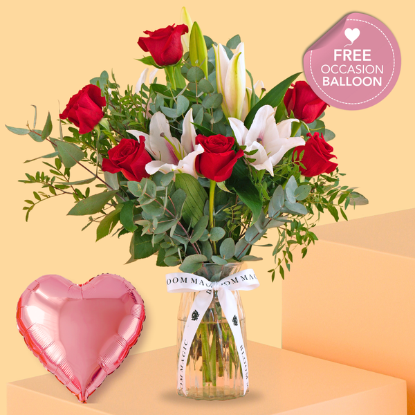 This is a very elegant bouquet, featuring large headed Red roses with scented pink oriental lilies, all stylishly arranged together with Irish grown eucalyptus in a glass vase.