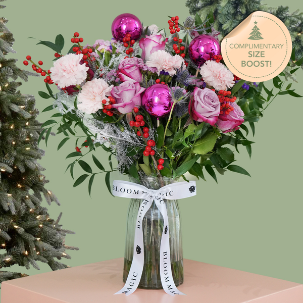 Capture the magic of the holiday season with our Twilight Christmas Vase. Filled with dreamy pink and purple roses, charming statice, carnations, and seasonal foliage, it's the perfect gift to spread warmth and joy to your loved ones this Christmas.