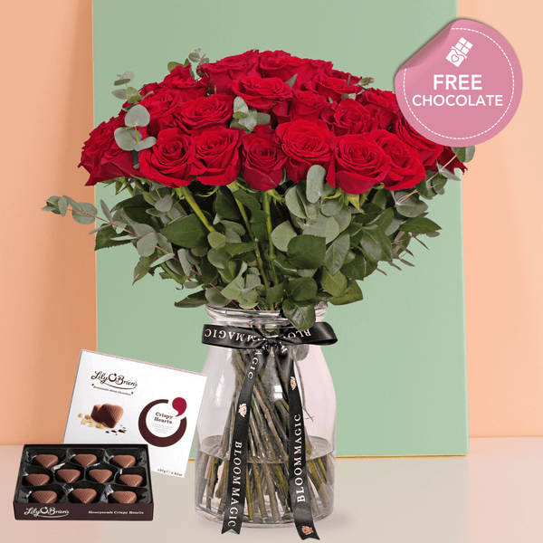 Celebrate love in grand style with the Valentine 50 La Vie En Rouge Vase, a luxurious arrangement of red roses, gypsophila, pistach leaves, and eucalyptus. These artisan blooms create an opulent display of passion, making it the perfect Valentine’s Day gift to convey deep affection and timeless sophistication.