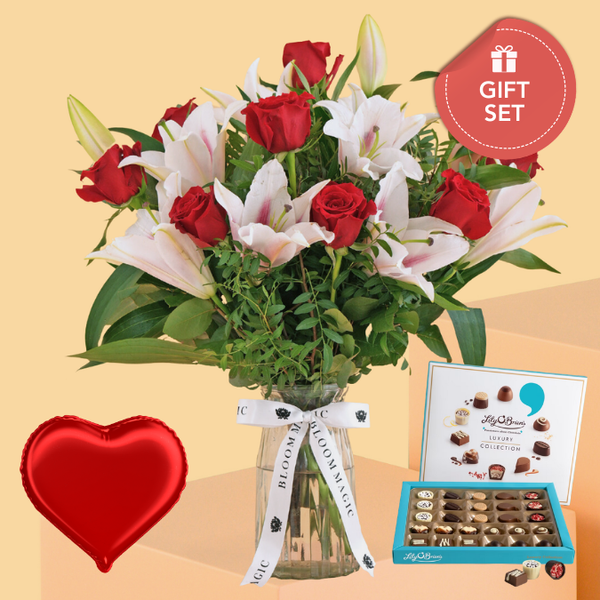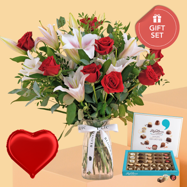 Indulge in the allure of love with the Valentine Romantic Red Roses and Pink Lily arrangement, artistically displayed in a vase with eucalyptus leaves. These artisan blooms are the epitome of a perfect Valentine's Day gift, harmonizing the passionate red roses and tender pink lilies to create a captivating expression of affection and admiration for your special someone.
