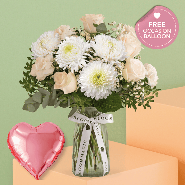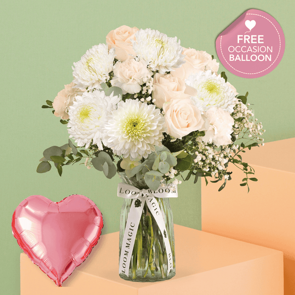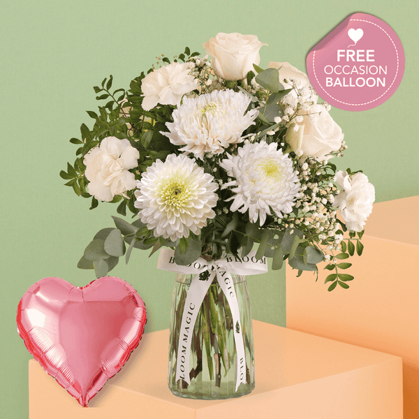 An elegant mix of white roses, carnations, chrysanthemums, and gypsophilia, complemented by pistach greenery and eucalyptus. A timeless vase arrangement that conveys purity and grace.
