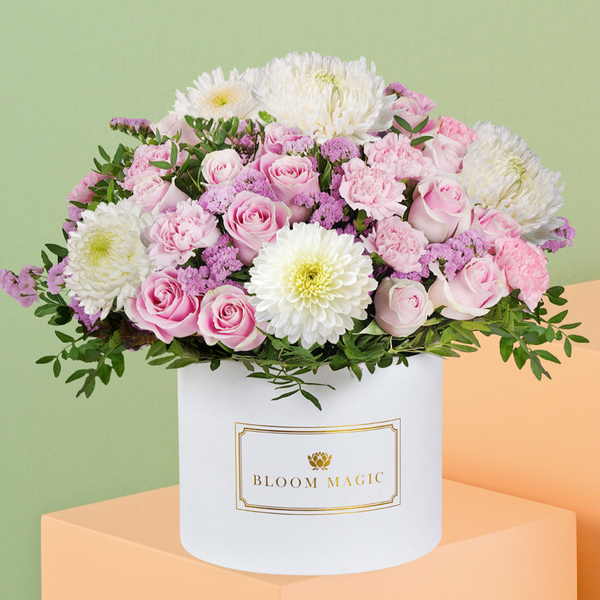 White & Pink Élégance is an enchanting floral arrangement featuring White Chrysanthemums, Pink Carnation, Pink Roses, Pink Statice, and lush eucalyptus and pistach foliage.