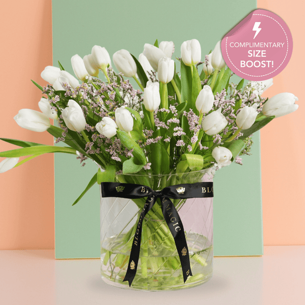 The White Tulip Delight showcases pristine tulips and delicate sea spray in a chic vase, exuding serenity and timeless beauty—perfect for any occasion.